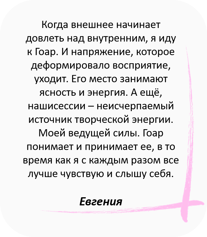 Коучинговая сессия с Гоар Давтян оказалась для меня очень приятным и полезным бонусом к программе Мini-MBA. Я отметила Гоар Давтян на встрече с профессиональными коучами 16 декабря благодаря позитивной энергетике, интеллекту, умением заинтересовать аудиторию реальными примерами успешного коучинга. Первая коучинговая сессия 3 февраля прошла для меня эффективно, позволив под другим углом посмотреть на проблему, влияющую на развитие карьеры и жизненные приоритеты. Полностью погрузившись в тему, она позволила мне понять, а главное принять то, над чем и посредством чего необходимо работать.
